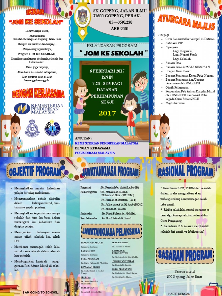 Program jom hadir ke sekolah. 7 orang wakil perutusan ucapan pasukan polis. Mar 24 2017 Program Jom Ke Sekolah Peringkat kebangsaan tahun 2017 dilancarkan oleh Menteri Pendidikan Malaysia Dato Seri Mahdzir Khalid di SMK Dato Syed Ahmad Kuala Nerang Kedah pada 5 Februari 2017. Murid-murid adalah generasi masa depan negara.
